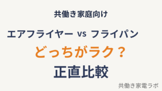 時短家電 エアフライヤー vs フライパン|どっちがラク?共働き家庭のリアル比較【2026年版】 エアフライヤーって気になるけど、 ・フライパンで十分じゃない?・本当にラクになる?・わざわざ買う必要ある? 👉 こう思いますよね。 結論からお伝えします。 結論:ラクさ重視ならエアフライヤー 比較した結果、 ... 2026.04.15 時短家電