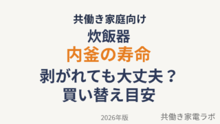 炊飯器 炊飯器の内釜寿命は何年?コーティング剥がれの原因と買い替え目安【2026年版】 炊飯器の内釜寿命は何年?コーティングが剥がれる原因や買い替えの目安を解説します。内釜を長持ちさせるコツやおすすめ炊飯器も紹介【2026年版】 2026.03.17 炊飯器炊飯器の使い方